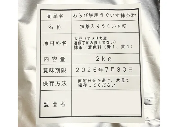 | 原材料名 | 大豆(アメリカ産、遺伝子組み換えでない)、抹茶/着色料(青1、黄4) |