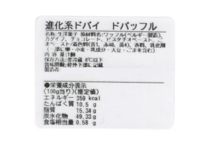 | 原材料名 | ワッフル(ベルギー製造)、カダイフ、チョコレート、ピスタチオペースト、ごまペースト/着色料(青1、赤40、黄4)、香料、乳化剤 |