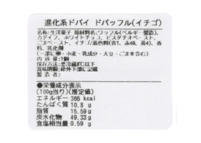 | 原材料名 | ワッフル(ベルギー製造)、カダイフ、ホワイトチョコ、ピスタチオペースト、ごまペースト、イチゴ/着色料(青1、赤40、黄4)、香料、乳化剤 |