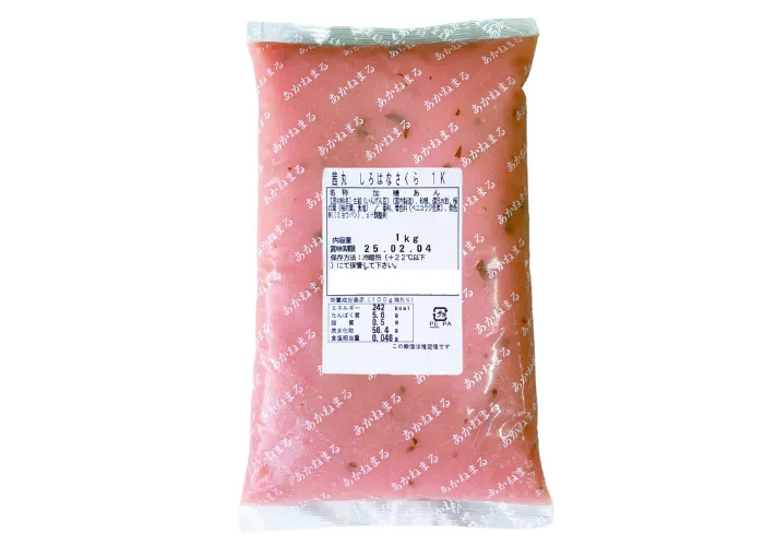 原材料名 | 生餡(いんげん豆)(国内製造)、砂糖、還元水飴、桜の葉、食塩/香料、着色料(ベニコウジ色素)、発光剤(ミョウバン)、pH調整剤 |