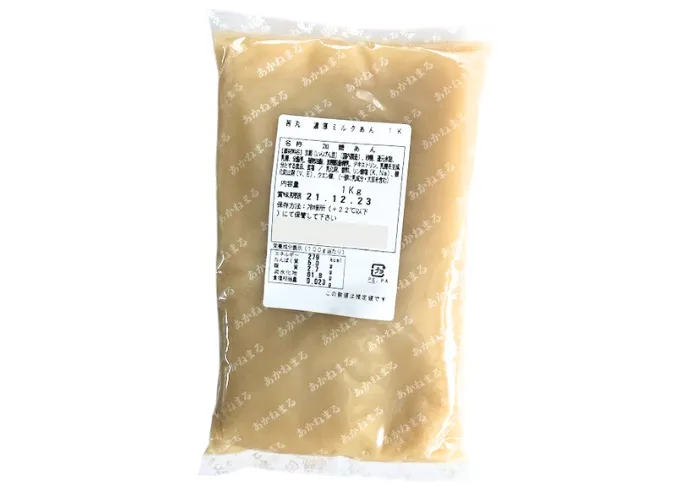 原材料名 | 生餡(いんげん豆)(国内製造)、砂糖、還元水飴、乳糖、全脂乳、植物油脂、加糖脱脂練乳、デキストリン、乳糖を主成分とする食品、食塩/乳化剤、香料、リン酸塩(K、Na)、酸化防止剤(V、E)、クエン酸、(一部に乳成分・大豆を含む) |