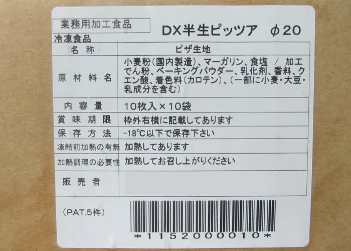 | 使用方法/注意事項 | ※一括表示が変更になることがございます。最新の情報は商品の一括表示をご確認ください。 <使用方法> 1枚毎に剥離シートがありますので凍結状態で必要枚数取り出します。1枚の場合、そのままソース、チーズ等お好みのトッピングの後、250℃前後に温めたオーブンで4分~5分程度焼成して下さい。(オーブン機種により温度、時間は前後します。) <注意事項> 品質が変わる場合がありますので一度解凍された商品の再凍結は不可となります。 開封後はラップ等で密閉し乾燥しない様にして下さい。 |