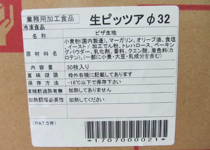 | 使用方法/注意事項 | ※一括表示が変更になることがございます。最新の情報は商品の一括表示をご確認ください。 <使用方法> 1枚毎に剥離シートがありますので凍結状態で必要枚数取り出します。1枚の場合、そのままソース、チーズ等お好みのトッピングの後、250℃前後に温めたオーブンで4分~5分程度焼成して下さい。(オーブン機種により温度、時間は前後します。) <注意事項> 品質が変わる場合がありますので一度解凍された商品の再凍結は不可となります。 開封後はラップ等で密閉し乾燥しない様にして下さい。 |