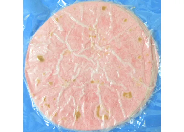 小麦粉主原料のしっとりとした食感の柔らかいトルティーヤ生地をピンク色に仕上げました。ラップサンド、タコス等の巻物、包みメニューやクリスピーピザのベース生地として幅広くお使い頂けます。