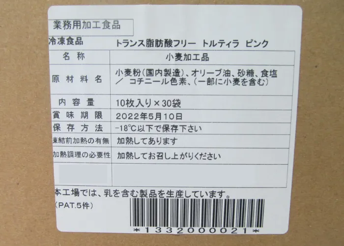 | 原材料名 | 小麦粉(国内製造)、オリーブ油、砂糖、食塩/コチニール色素、(一部に小麦を含む) |