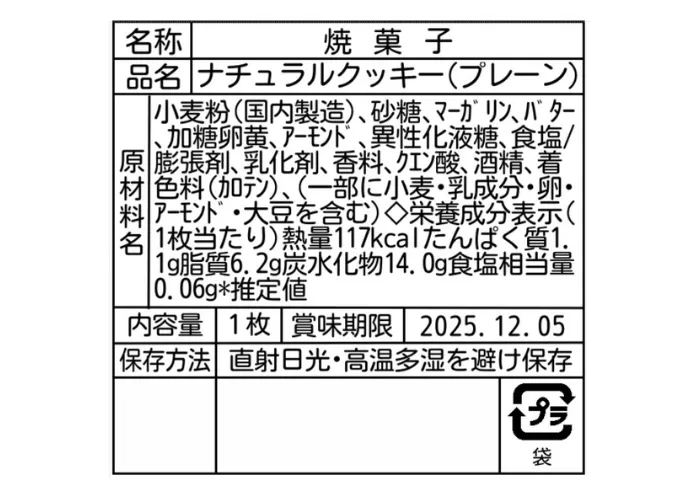 | 原材料名 | 小麦粉(国内製造)、砂糖、マーガリン、バター、加糖卵黄、アーモンド、異性化液糖、食塩/膨張剤、乳化剤、香料、クエン酸、酒精、着色料(カロテン)、(一部に小麦・乳成分・卵・アーモンド・大豆を含む) |