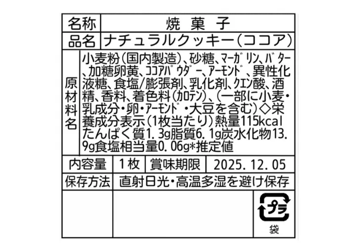 | 原材料名 | 小麦粉(国内製造)、砂糖、マーガリン、バター、加糖卵黄、ココアパウダー、アーモンド、異性化液糖、食塩/膨張剤、乳化剤、クエン酸、酒精、香料、着色料(カロテン)、(一部に小麦・乳成分・卵・アーモンド・大豆を含む) |