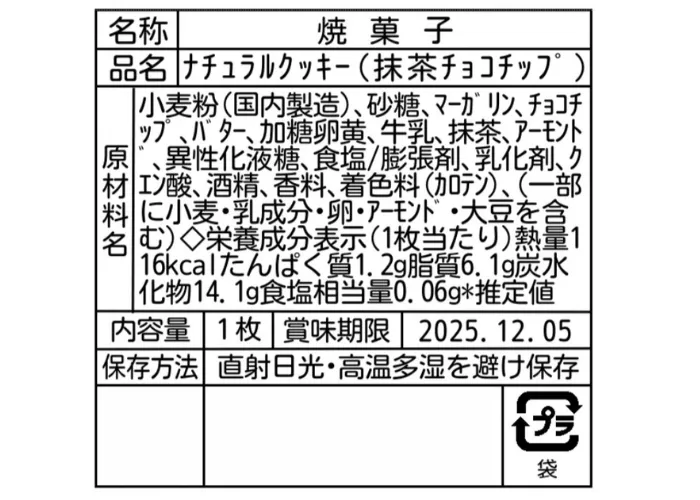 | 原材料名 | 小麦粉(国内製造)、砂糖、マーガリン、チョコチップ、バター、加糖卵黄、牛乳、抹茶、アーモンド、異性化液糖、食塩/膨張剤、乳化剤、クエン酸、酒精、香料、着色料(カロテン)、(一部に小麦・乳成分・卵・アーモンド・大豆を含む) |
