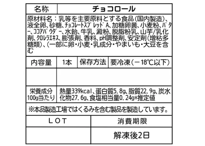 | 原材料名 | 液全卵(国内製造)、乳等を主要原料とする食品、砂糖、チョコレートスプレッド(砂糖、牛乳、チョコレート、ココアパウダー)、加糖卵黄、小麦粉、バター、ココアパウダー、水飴、牛乳、澱粉、脱脂粉乳、粉末山芋/乳化剤、クロレラエキス、膨張剤、香料、pH調整剤、増粘多糖類、(一部に乳成分・卵・小麦・大豆・やまいもを含む) |