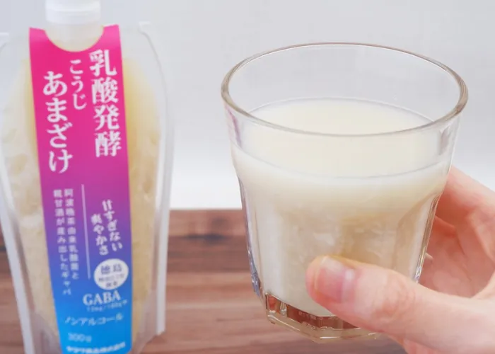 阿波晩茶由来の乳酸菌を用いて、甘酒を乳酸発酵させた糀甘酒です。発酵過程でGABAを産み出します(含有量12mg/100g中)。爽やかな酸味が特徴的で、酒粕や添加物は使用していない、甘酒になります。