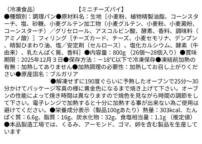 | 原材料名 | 【生地】小麦粉、植物精製油脂、コーンスターチ、塩、砂糖、小麦グルテン加工物(小麦グルテン、小麦粉、小麦澱粉、コーンスターチ)/グリセロール、アスコルビン酸、酵素、香料、調味料(アミノ酸)【フィリング】チーズカード、チーズ、小麦セモリナ、デンプン、精製ひまわり油、塩/安定剤(セルロース)、塩化カルシウム、酵素(牛由来)、乳たんぱく質、香料 |