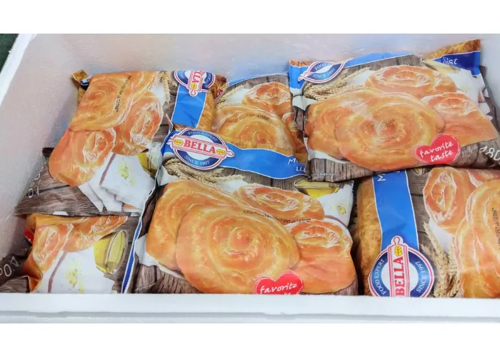 ブルガリア産の塩漬けチーズ「シレネ」を薄いパートフィロ生地で包んでツイスト状に仕上げたブルガリアの伝統的家庭料理「ヴァニツァ」の手のひらサイズタイプです。