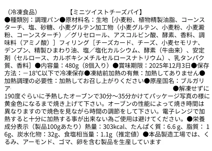 | 原材料名 | 【生地】小麦粉、植物精製油脂、コーンスターチ、塩、砂糖、小麦グルテン加工物(小麦グルテン、小麦粉、小麦澱粉、コーンスターチ)/グリセロール、アスコルビン酸、酵素、香料、調味料(アミノ酸)【フィリング】チーズカード、チーズ、小麦セモリナ、デンプン、精製ひまわり油、塩/塩化カルシウム、酵素(牛由来)、安定剤(セルロース、カルボキシメチルセルロースナトリウム)、乳タンパク質、香料 |