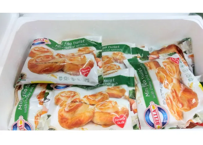 薄いパートフィロ生地でほうれん草とブルガリア産の塩漬けチーズ「シレネ」包んでツイスト状に仕上げたブルガリアの伝統的家庭料理「ヴァニツァ」の手のひらサイズタイプです。