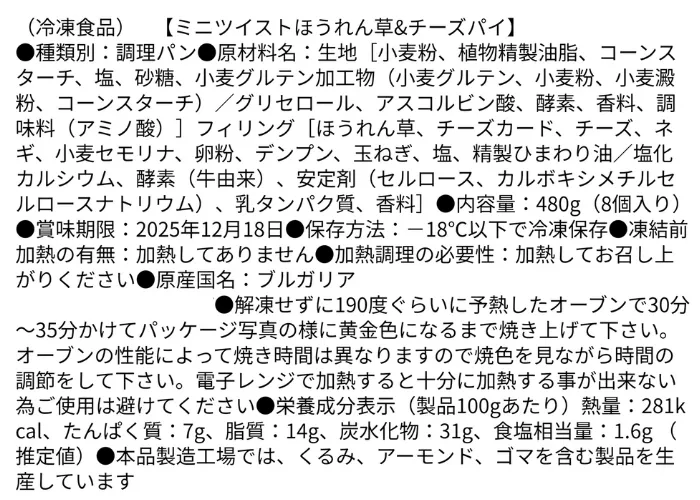| 原材料名 | 【生地】小麦粉、植物精製油脂、コーンスターチ、塩、砂糖、小麦グルテン加工物(小麦グルテン、小麦粉、小麦澱粉、コーンスターチ)/グリセロール、アスコルビン酸、酵素、香料、調味料(アミノ酸)【フィリング】ほうれん草、チーズカード、チーズ、ネギ、小麦セモリナ、卵粉、デンプン、玉ねぎ、塩、精製ひまわり油/塩化カルシウム、酵素(牛由来)、安定剤(セルロース、カルボキシメチルセルロースナトリウム)、乳タンパク質、香料 |