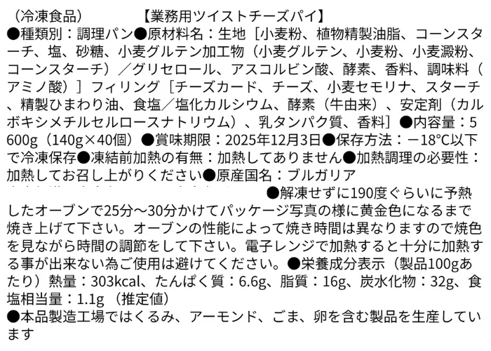| 原材料名 | 【生地】小麦粉、植物精製油脂、コーンスターチ、塩、砂糖、小麦グルテン加工物(小麦グルテン、小麦粉、小麦澱粉、コーンスターチ)/グリセロール、アスコルビン酸、酵素、香料、調味料(アミノ酸)【フィリング】チーズカード、チーズ、小麦セモリナ、スターチ、精製ひまわり油、食塩/塩化カルシウム、酵素(牛由来)、安定剤(カルボキシメチルセルロースナトリウム)、乳タンパク質、香料 |