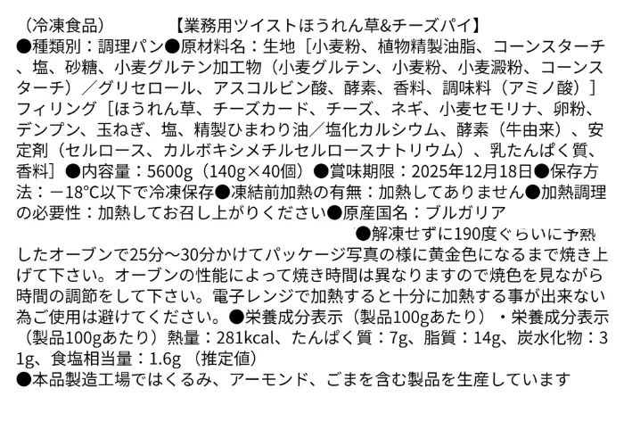 | 原材料名 | 【生地】小麦粉、植物精製油脂、コーンスターチ、塩、砂糖、小麦グルテン加工物(小麦グルテン、小麦粉、小麦澱粉、コーンスターチ)/グリセロール、アスコルビン酸、酵素、香料、調味料(アミノ酸)【フィリング】ほうれん草、チーズカード、チーズ、ネギ、小麦セモリナ、卵粉、デンプン、玉ねぎ、塩、精製ひまわり油/塩化カルシウム、酵素(牛由来)、安定剤(セルロース、カルボキシメチルセルロースナトリウム)、乳たんぱく質、香料 |