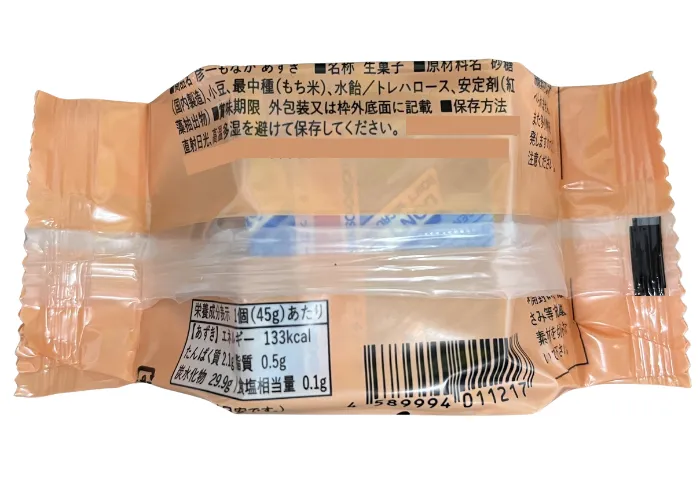 | 原材料名 | 砂糖(国内製造)、小豆、最中種(もち米)、水飴/トレハロ-ス、安定剤(紅藻抽出物) |