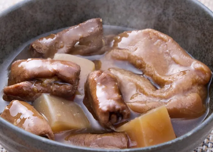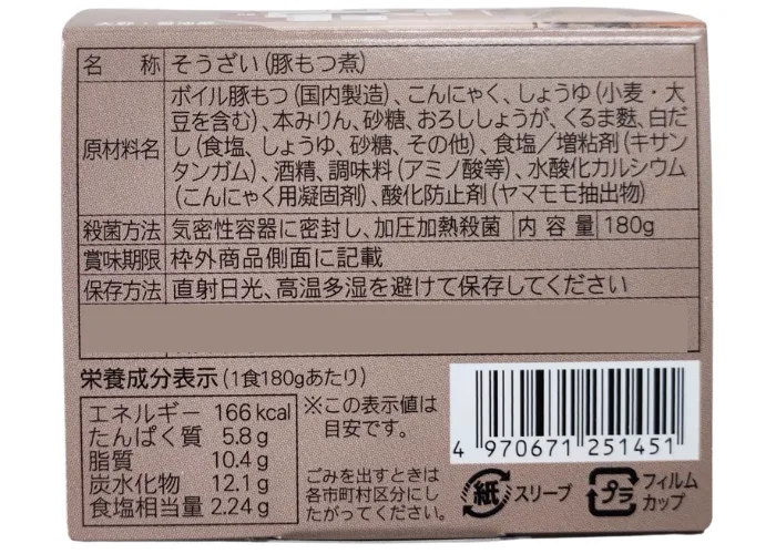 | 原材料名 | ボイル豚もつ(国内製造)、こんにゃく、しょうゆ(小麦・大豆を含む)、本みりん、砂糖、おろししょうが、くるま麩、白だし(食塩、しょうゆ、砂糖、その他)、食塩/増粘剤(キサンタンガム)、酒精、調味料(アミノ酸等)、水酸化カルシウム(こんにゃく用凝固剤)、酸化防止剤(ヤマモモ抽出物) |