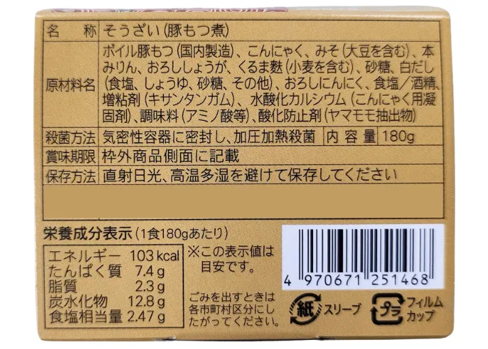 | 原材料名 | ボイル豚もつ(国内製造)、こんにゃく、みそ(大豆を含む)、本みりん、おろししょうが、くるま麩(小麦を含む)、砂糖、白だし(食塩、しょうゆ、砂糖、その他)、おろしにんにく、食塩/酒精、増粘剤(キサンタンガム)、水酸化カルシウム(こんにゃく用凝固剤)、調味料(アミノ酸等)、酸化防止剤(ヤマモモ抽出物) |