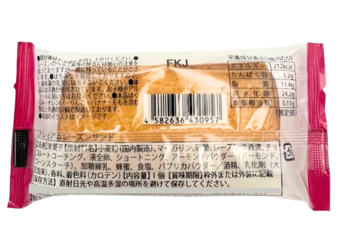 | 原材料名 | 小麦粉(国内製造)、マーガリン、砂糖、レーズン洋酒漬、チョコレートコーチング、液全卵、ショートニング、アーモンドパウダー(アーモンド、コーンスターチ)、加糖練乳、蜂蜜、食塩、パプリカパウダー/酒精、乳化剤(大豆由来)、香料、着色料(カロテン) |