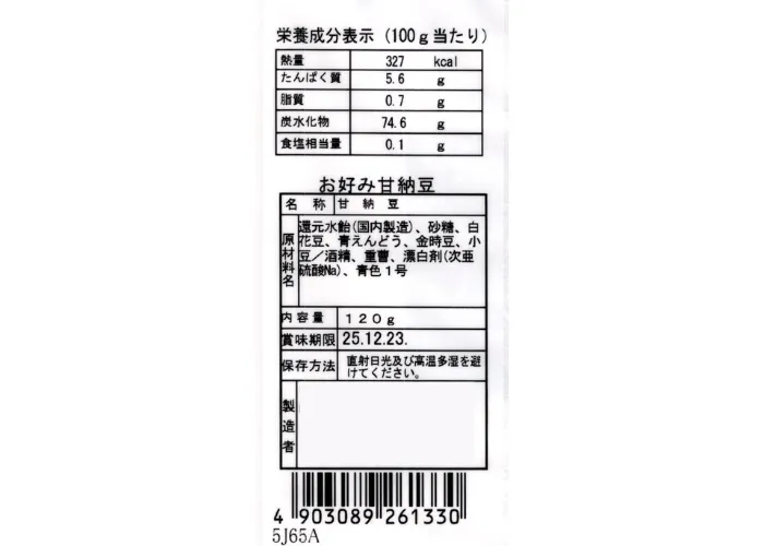 | 原材料名 | 還元水飴(国内製造)、砂糖、白花豆、青えんどう、金時豆、小豆/酒精、重曹、漂白剤(次亜硫酸Na)、青色1号 |