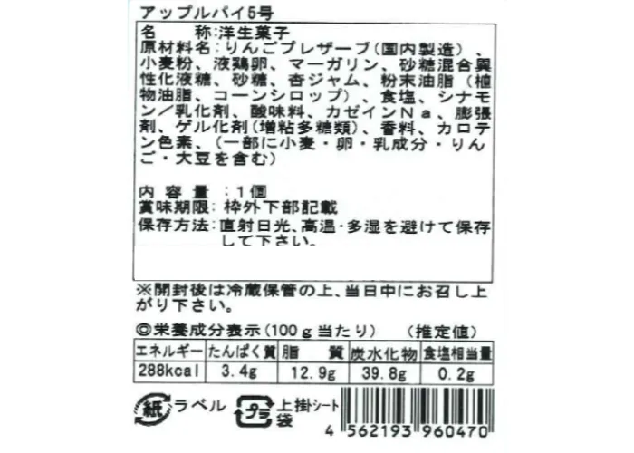 | 原材料名 | りんごプレザーブ(国内製造)、小麦粉、液鶏卵、マーガリン、砂糖混合異性化液糖、砂糖、杏ジャム、粉末油脂(植物油脂、コーンシロップ)、食塩、シナモン/乳化剤、酸味料、カゼインNa、膨張剤、ゲル化剤(増粘多糖類)、香料、カロテン色素、(一部に小麦・卵・乳成分・りんご・大豆を含む) |
