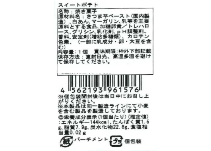 | 原材料名 | さつまいもペースト(国内製造)、白あん、マーガリン、乳等を主要原料とする食品、加糖卵黄/トレハロース、グリシン、乳化剤、香料、pH調整剤、安定剤(増粘多糖類)、カロテン色素、(一部に乳成分・卵・大豆を含む) |