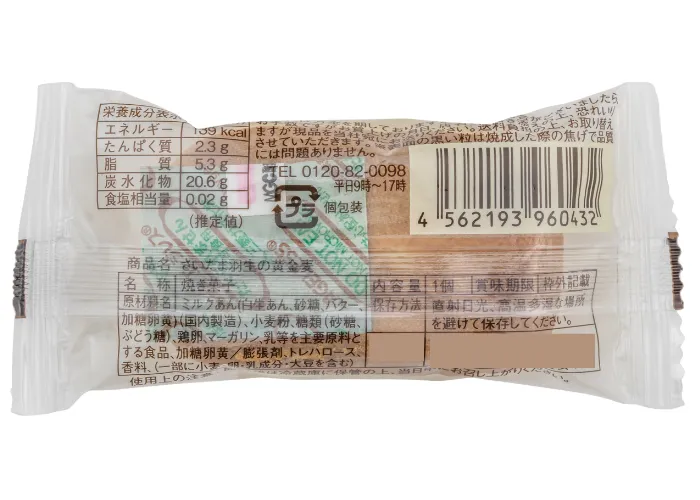 | 原材料名 | ミルクあん(白生あん、砂糖、バター、加糖卵黄)(国内製造)、小麦粉、糖類(砂糖、ぶどう糖)、鶏卵、マーガリン、乳等を主要原料とする食品、加糖卵黄/膨張剤、トレハロース、香料、(一部に小麦・卵・乳成分・大豆を含む) |
