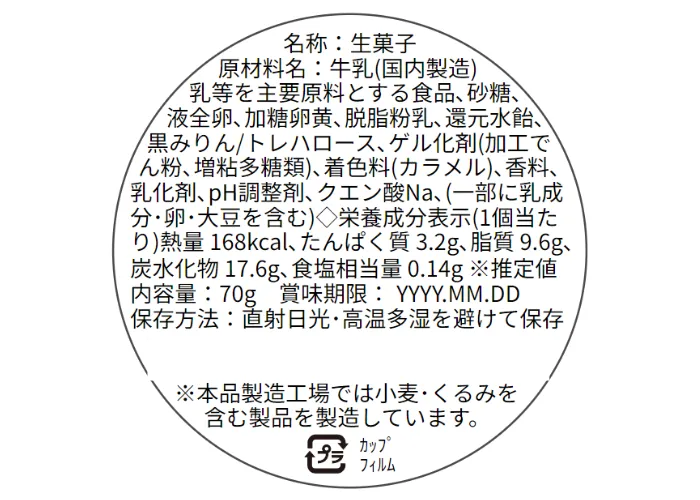 | 原材料名 | 牛乳(国内製造)、乳等を主要原料とする食品、砂糖、液全卵、加糖卵黄、脱脂粉乳、還元水飴、黒みりん/トレハロース、ゲル化剤(加工でん粉、増粘多糖類)、着色料(カラメル)、香料、乳化剤、pH調整剤、クエン酸Na、(一部に乳成分・卵・大豆を含む) |