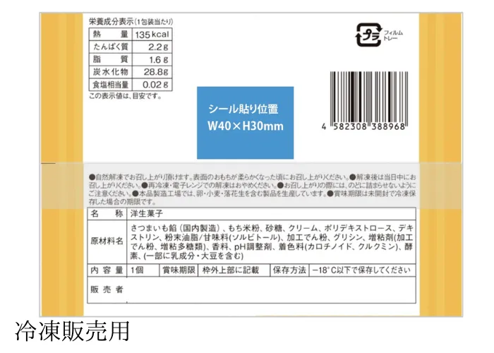 | 原材料名 | さつまいも餡(国内製造)、もち米粉、砂糖、クリーム、ポリデキストロース、デキストリン、粉末油脂/甘味料(ソルビトール)、加工でん粉、グリシン、増粘剤(加工でん粉、増粘多糖類)、香料、pH調整剤、着色料(カロチノイド、クルクミン)、酵素、(一部に乳成分・大豆を含む) |