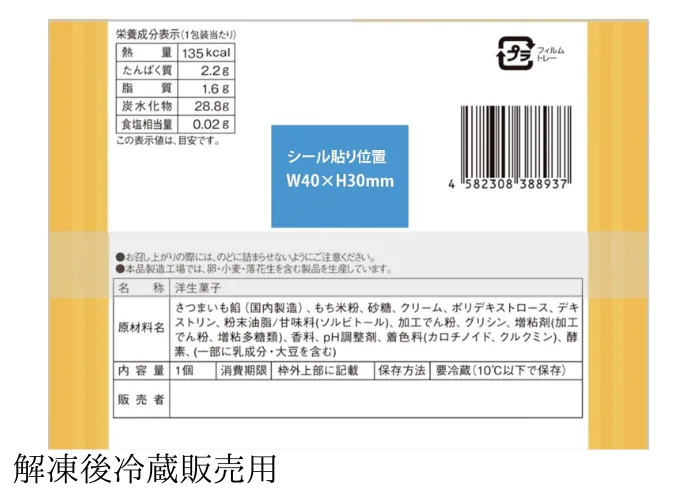 | <小売用>一括表示/賞味期限印字/JANコード印字 | <冷凍販売> 印刷済み/印刷済み/印刷済み <解凍後冷蔵販売> 印刷済み/なし/印刷済み |