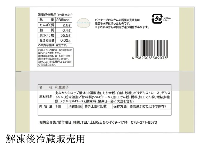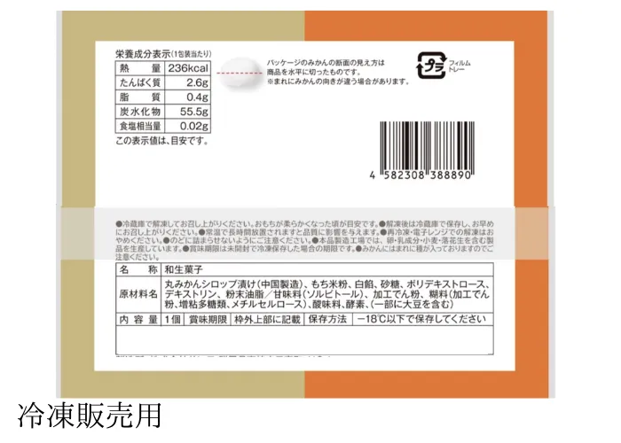 | 原材料名 | 丸みかんシロップ漬け(中国製造)、もち米粉、白餡、砂糖、ポリデキストロース、デキストリン、粉末油脂/甘味料(ソルビトール)、加工でん粉、糊料(加工でん粉、増粘多糖類、メチルセルロース)、酸味料、酵素、(一部に大豆を含む) |