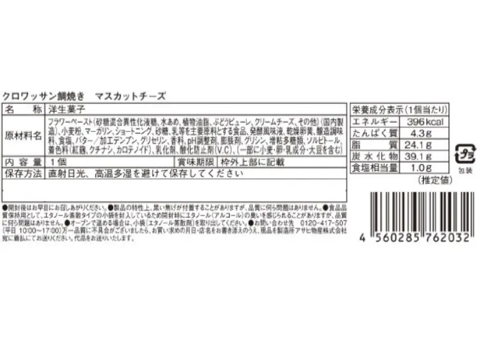 | 原材料名 | フラワーペースト(砂糖混合異性化液糖、水あめ、植物油脂、ぶどうピューレ、クリームチーズ、その他)(国内製造)、小麦粉、マーガリン、ショートニング、砂糖、乳等を主要原料とする食品、発酵風味液、乾燥卵黄、醸造調味料、食塩、バター/加工デンプン、グリセリン、香料、pH調整剤、膨脹剤、グリシン、増粘多糖類、ソルビトール、着色料(紅麹、クチナシ、カロテノイド)、乳化剤、酸化防止剤(V.C)、(一部に小麦・卵・乳成分・大豆を含む) |