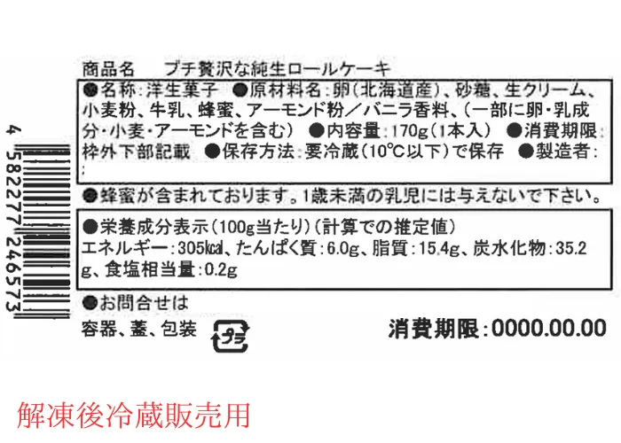 | 原材料名 | 卵(北海道産)、砂糖、生クリーム、小麦粉、牛乳、蜂蜜、アーモンド粉/バニラ香料、(一部に卵・乳成分・小麦・アーモンドを含む) |