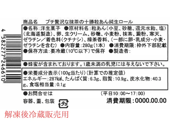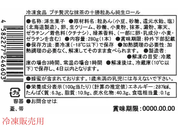 | 原材料名 | 粒あん(小豆、砂糖、還元水飴、塩)(北海道製造)、卵、生クリーム、砂糖、小麦粉、抹茶、澱粉、寒天、ゼラチン/着色料(クチナシ)、緑茶香料、(一部に卵・乳成分・小麦・ゼラチンを含む) |