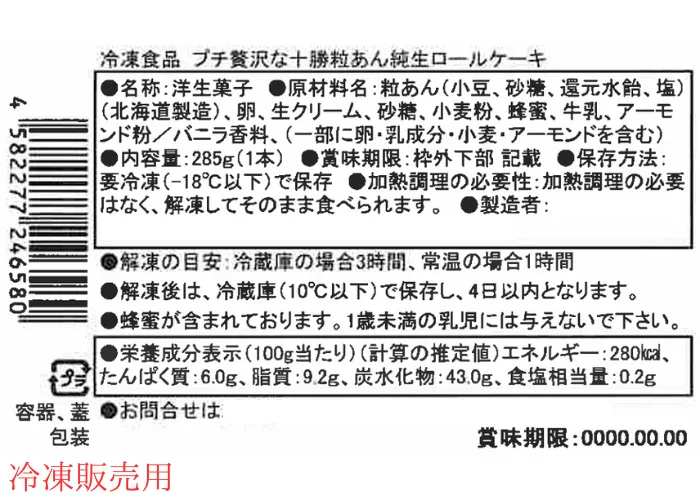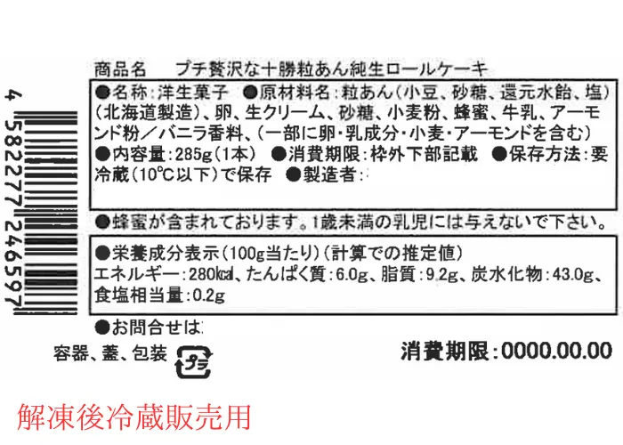 | 原材料名 | 粒あん(小豆、砂糖、還元水飴、塩)(北海道製造)、卵、生クリーム、砂糖、小麦粉、蜂蜜、牛乳、アーモンド粉/バニラ香料、(一部に卵・乳成分・小麦・アーモンドを含む) |
