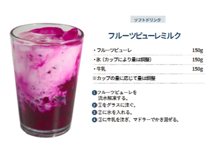 | 使用方法/注意事項 | ※一括表示が変更になることがございます。最新の情報は商品の一括表示をご確認ください。 <使用方法> 本品は解凍後、お茶飲料、牛乳、ヨーグルト、炭酸水などと調合して、美味しいドリンクやデザートにすることができます。 <注意事項> 冷凍状態により商品同士が貼り付く事がございます。無理に力を入れて剥いでしまうと、袋が破れてしまう事があります。 |