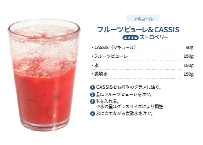お茶や牛乳と割ってドリンクやデザートを作れる果肉入りのフルーツピューレです。ストロベリーは鮮やかなピンク色で、果肉はジューシー。程よい甘酸っぱさと芳醇な香り、豊富な栄養素から『果物の女王』と称されています。