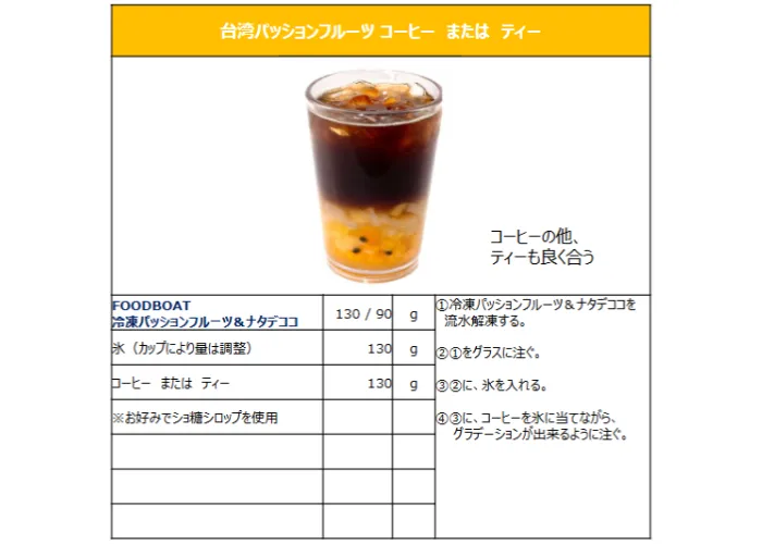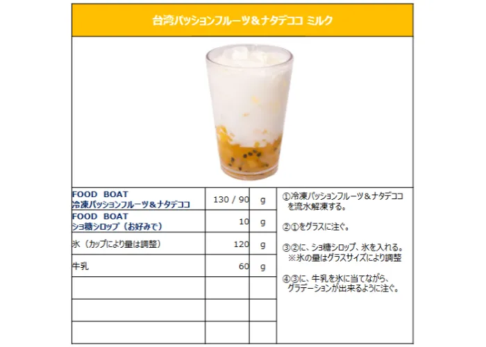 | 原材料名 | パッションフルーツ、ショ糖型液糖、ナタデココシラップ漬け(ココナッツ、砂糖) |