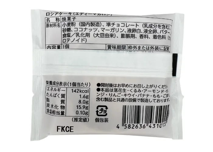 | 原材料名 | 小麦粉(国内製造)、準チョコレート(乳成分を含む)、砂糖、ココナッツ、マーガリン、液卵白、液全卵、バター、食塩/乳化剤(大豆由来)、膨脹剤、香料、着色料(カロテノイド) |