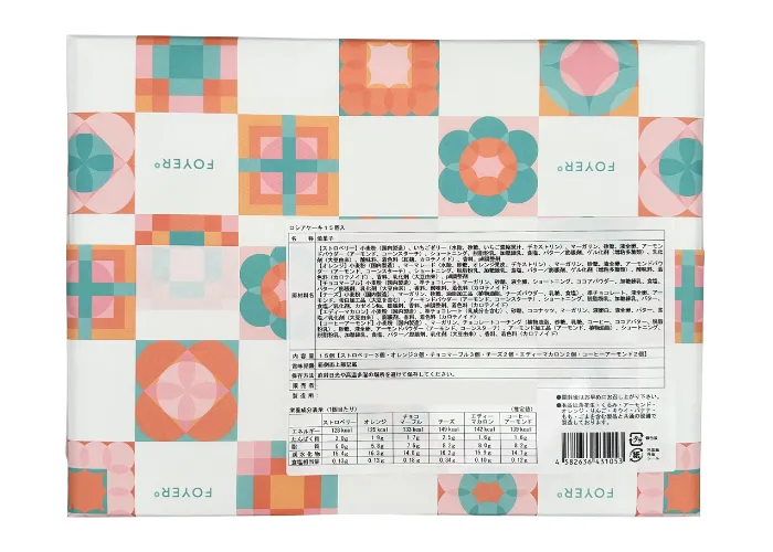 | 1個サイズ(入数)/寸法 | 15個(ストロベリー×3、オレンジ×3、チョコマーブル×3、エディーマカロン×2、チーズ×2、コーヒーアーモンド×2)/-/- |