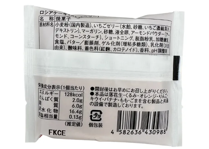 | 原材料名 | 小麦粉(国内製造)、いちごゼリー(水飴、砂糖、いちご濃縮果汁、デキストリン)、マーガリン、砂糖、液全卵、アーモンドパウダー(アーモンド、コーンスターチ)、ショートニング、脱脂粉乳、加糖練乳、食塩、バター/膨脹剤、ゲル化剤(増粘多糖類)、乳化剤(大豆由来)、酸味料、着色料(紅麴、カロテノイド)、香料、pH調整剤 |