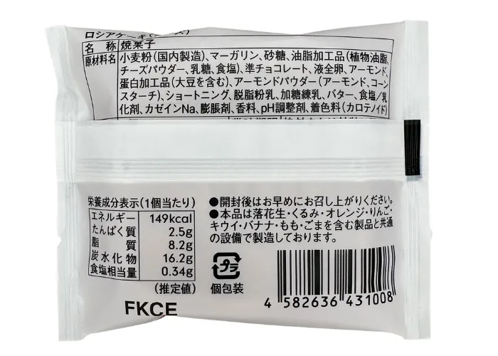 | 原材料名 | 小麦粉(国内製造)、マーガリン、砂糖、油脂加工品(植物油脂、チーズパウダー、乳糖、食塩)、準チョコレート、液全卵、アーモンド、蛋白加工品(大豆を含む)、アーモンドパウダー(アーモンド、コーンスターチ)、ショートニング、脱脂粉乳、加糖練乳、バター、食塩/乳化剤、カゼインNa、膨脹剤、香料、pH調整剤、着色料(カロテノイド) |