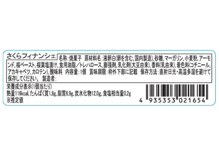 | 原材料名 | 液卵白(卵を含む、国内製造)、砂糖、マーガリン、小麦粉、アーモンド、桜ペースト、桜葉塩漬け、食用油脂/トレハロース、膨張剤、乳化剤(大豆由来)、香料(乳由来)、着色料(コチニール、アカキャベツ、カロテン)、酸味料 |