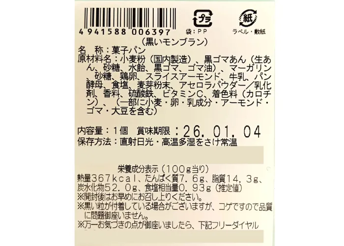 | 原材料名 | 小麦粉(国内製造)、黒ゴマあん(生あん、砂糖、水飴、黒ゴマ、ゴマ油)、マーガリン、砂糖、鶏卵、スライスアーモンド、牛乳、パン酵母、食塩、麦芽粉末、アセロラパウダー/乳化剤、香料、硫酸鉄、ビタミンC、着色料(カロチン)、(一部に小麦・卵・乳成分・アーモンド・ゴマ・大豆を含む) |