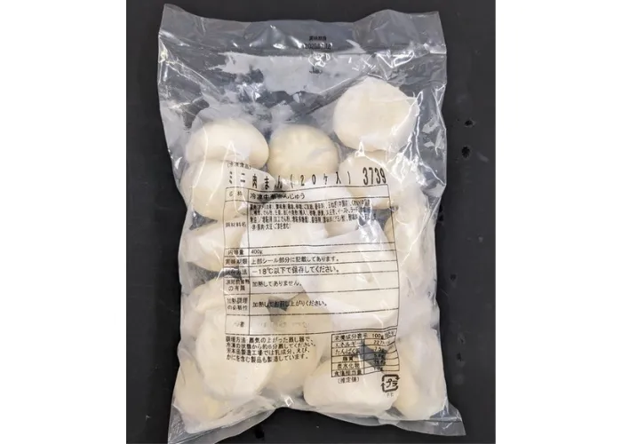 | 原材料名 | 豚肉(アメリカ産)、調味液(醤油、砂糖、ごま油、香辛料)、玉ねぎ(中国産)、くわい(中国産)、椎茸、でん粉、生姜、皮〔小麦粉(輸入)、砂糖、卵黄、大豆粉、イースト、ラード、食塩、植物油〕/増粘剤(加工でん粉、増粘多糖類)、膨張剤、調味料(アミノ酸)、酸味料、(一部に小麦・卵・豚肉・大豆・ごまを含む) |