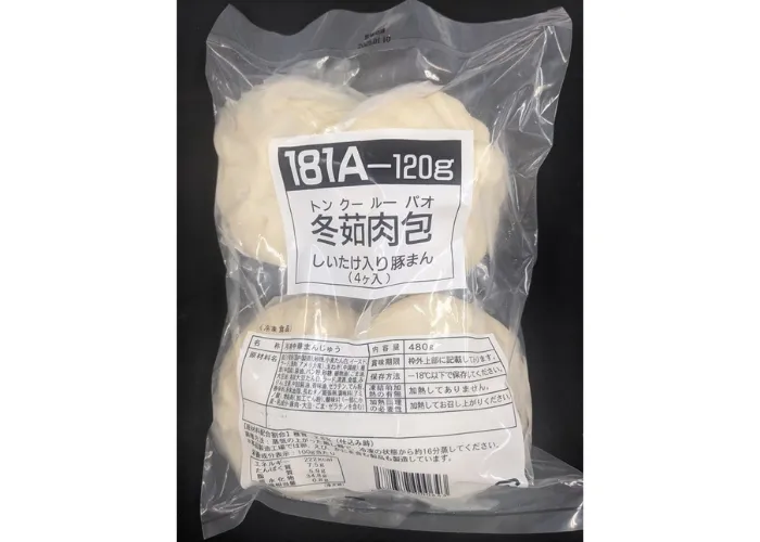 | 原材料名 | 皮〔小麦粉(国内製造)、砂糖、小麦たん白、イースト、ラード〕、豚肉(アメリカ産)、玉ねぎ(中国産)、椎茸(中国産)、醤油、パン粉、砂糖、植物油(ごま油、大豆油)、粒状大豆たん白、ラード、清酒、食塩、みりん、生姜、中国醤油、香味油、ゼラチン、でん粉、香辛料、粉末油脂、長ねぎ/膨張剤、調味料(アミノ酸)、増粘剤(加工でん粉)、酸味料、(一部に小麦・乳成分・豚肉・大豆・ごま・ゼラチンを含む) |