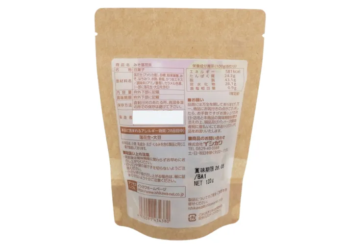| 原材料名 | 落花生(アメリカ産)、砂糖、みそ(大豆を含む)、蜂蜜、水飴、デキストリン、かつおエキス/加工澱粉、カラメル色素、酸味料(アミノ酸等) |