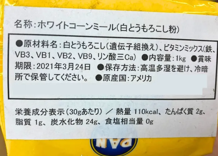 | 原材料名 | 白とうもろこし(遺伝子組み換え)/ビタミンミックス(鉄、VB3、VB1、VB2、VB9、リン酸三Ca) |